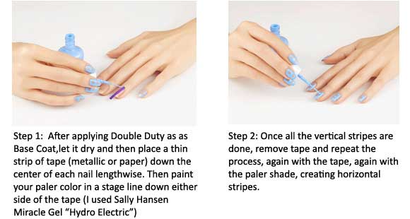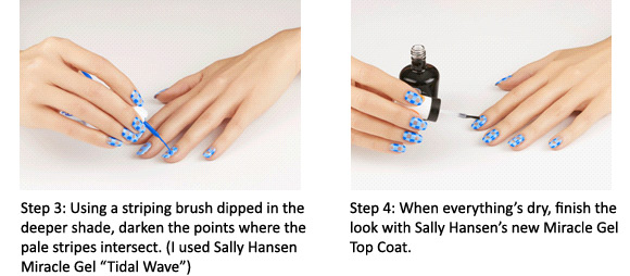 GINGHAM & (SURPRISE!) NEGATIVE SPACE 'For this look, you need the perfect translucent backdrop—I used Sally Hansen Double Duty Base & Top Coat. And then you actually need two different shades of any color, one lighter and one darker, to give the illusion that a sheer crosshatching is being overlapped. I used two Sally Hansen Miracle Gel colors, as the lighter color, “Hydro Electric”, and a deeper blue called 'Tidal Wave‘ and I finished the look with Sally Hansen Miracle Gel Top Coat'